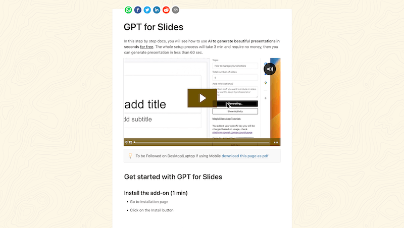 GPT for Slides je inovativní nástroj, který využívá umělou inteligenci k rychlému a efektivnímu vytváření prezentací. Tento nástroj je navržen tak, aby vám pomohl transformovat vaše nápady na působivé prezentace během několika sekund. GPT for Slides nabízí širokou škálu funkcí, včetně automatického generování slajdů, přizpůsobení designu a možnosti sdílení prezentací. Díky svému intuitivnímu a uživatelsky přívětivému rozhraní je GPT for Slides ideální volbou pro každého, kdo chce zlepšit své prezentace a využít sílu umělé inteligence pro vytváření působivých prezentací.