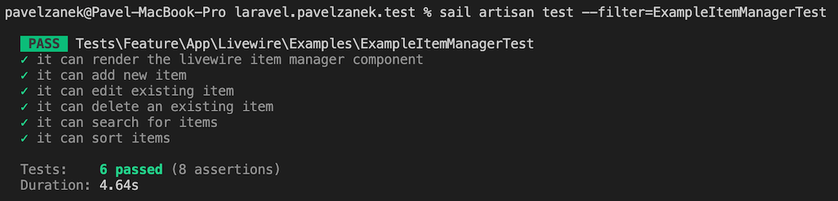 Pro testování Livewire komponenty je pak také použit balíček Pest, který jsme v předchozím návodu také využili.