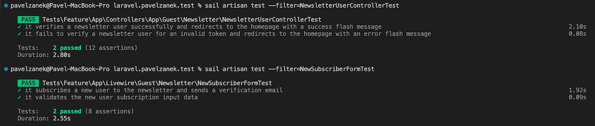 V těchto testech ověříme, zda se uživatelé mohou přihlasit k newsletteru a ověřují, zda se odesílají ověřovací e-maily a zda se správně zobrazují flash zprávy.