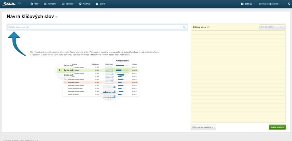 Po přihlášení do Skliku se nejdříve začnu ptát návrhu klíčových slov na dotazy, které jsem si sepsal na papír. Další postup záleží na projektu a na konkrétním klíčovém slově. Z návrhu totiž můžeme vybírat slova, která jsou relevantní a poté je stáhneme.