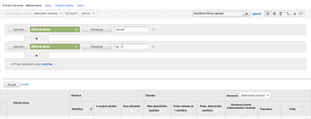 - “Vyloučit”- “klíčové slovo” – “obsahuje” – “np -/ (not provided) a (not set)”
