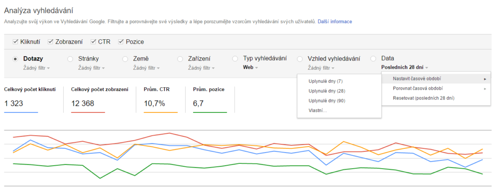 Tento nástroj doporučuji projít a udělat si obrázek o tom, jak tento nástroj funguje. Můžete si zvolit i další časové období – bohužel však maximálně můžete vybrat data za posledních 90 dní. Pokud využíváte GSC, určitě doporučuji jej propojit s Google Analytics. Pak budete mít údaje i za delší časové období. Google search console také bohužel zobrazuje v přehledu pouze 1 000 klíčových slov / frází.