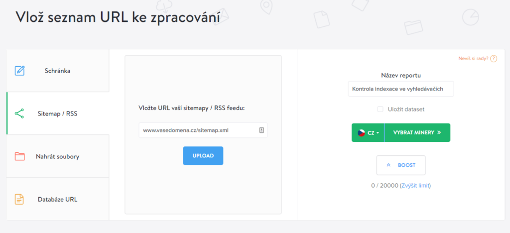 - Choose "Sitemap / RSS" and enter the sitemap URL, you can rename the report and choose "Go to miners"